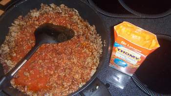 Die Gratin Sauce für Nudeln-Schinken habe ich mit Hackfleisch gemacht.
